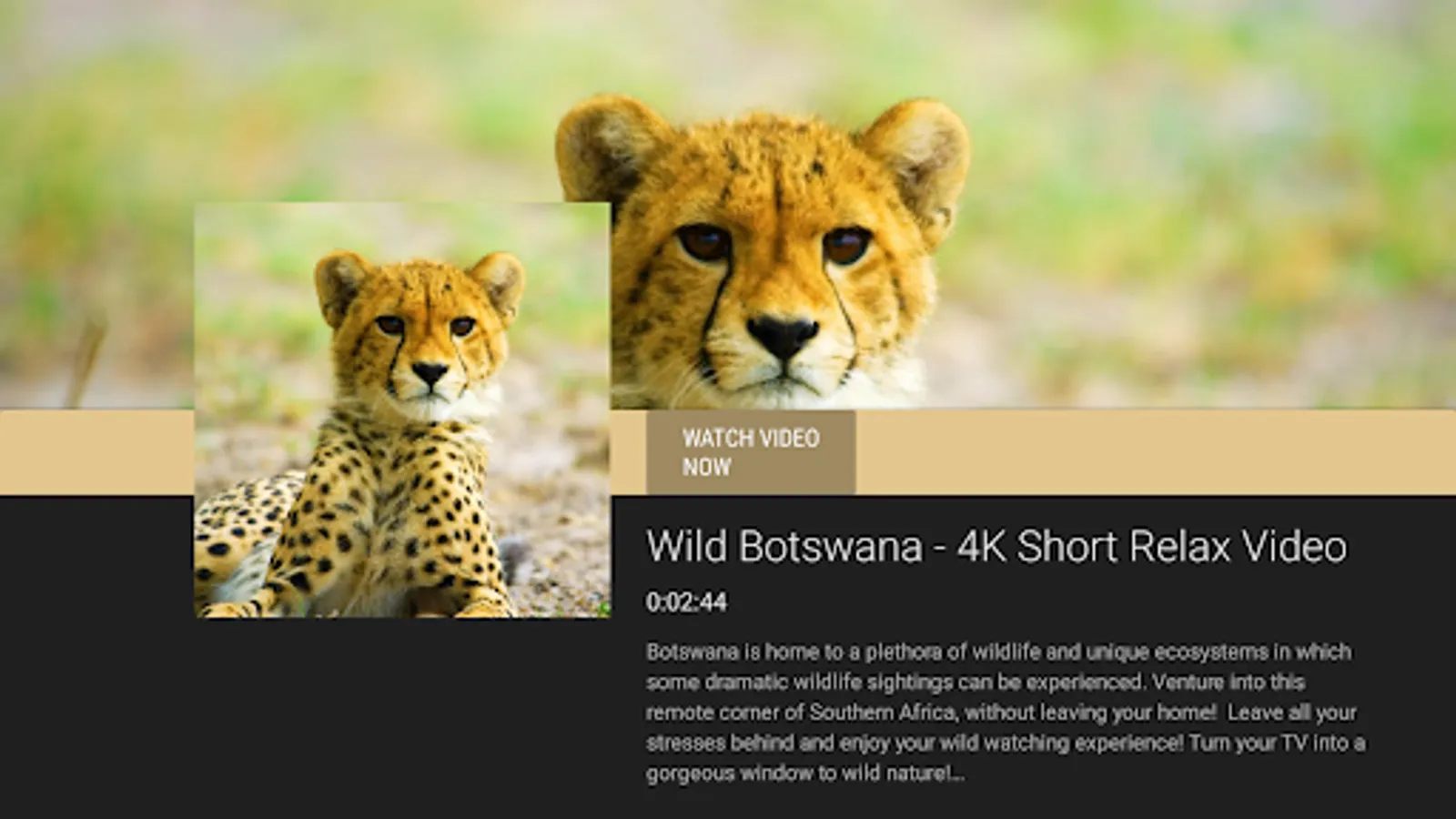 In Calm Wildlife TV library, you will find astonishing natural sceneries and the views of wild animals from Africa, Europe, Asia, and America. Bring wild nature inside! Get new experience while watching wildlife videos from Calm Wildlife TV