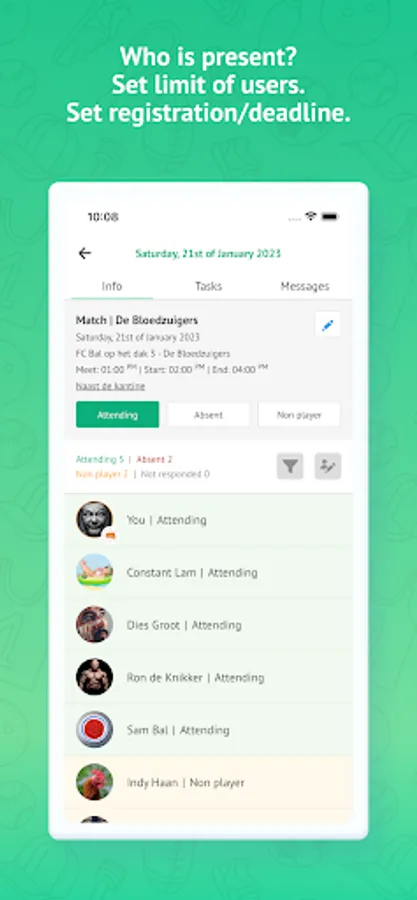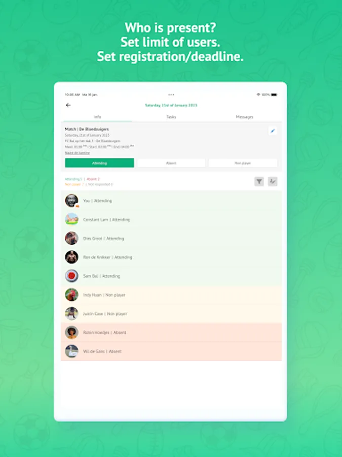With Teamy, you're always informed about who is present and who is not. Everyone who hasn't registered for an activity a few days prior will receive a notification about it. The same applies to changes in the schedule. However, with Teamy, you can do much more, such as:
