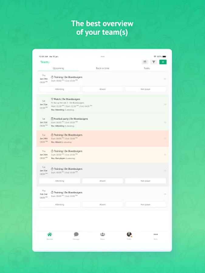 Teamy was developed in response to our own frustrations and feedback from other amateur teams about the recurring question: who is present and who is not? This led to the idea of creating a user-friendly app for all amateur sports teams, where the attendance of each individual can be indicated.