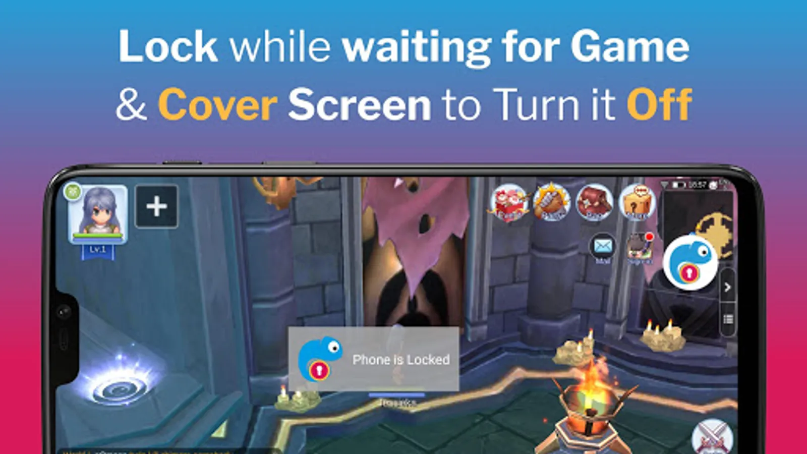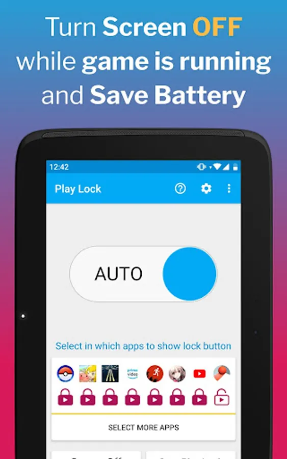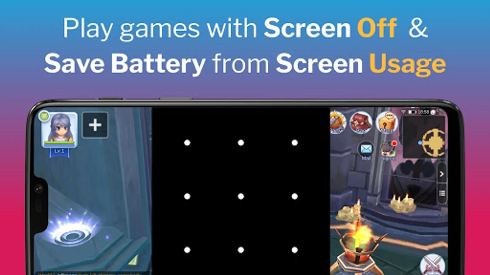 Boost game battery performance - turn Screen Off while game is auto playing and save battery life from screen usage, while keeping the phone safely locked in pocket.