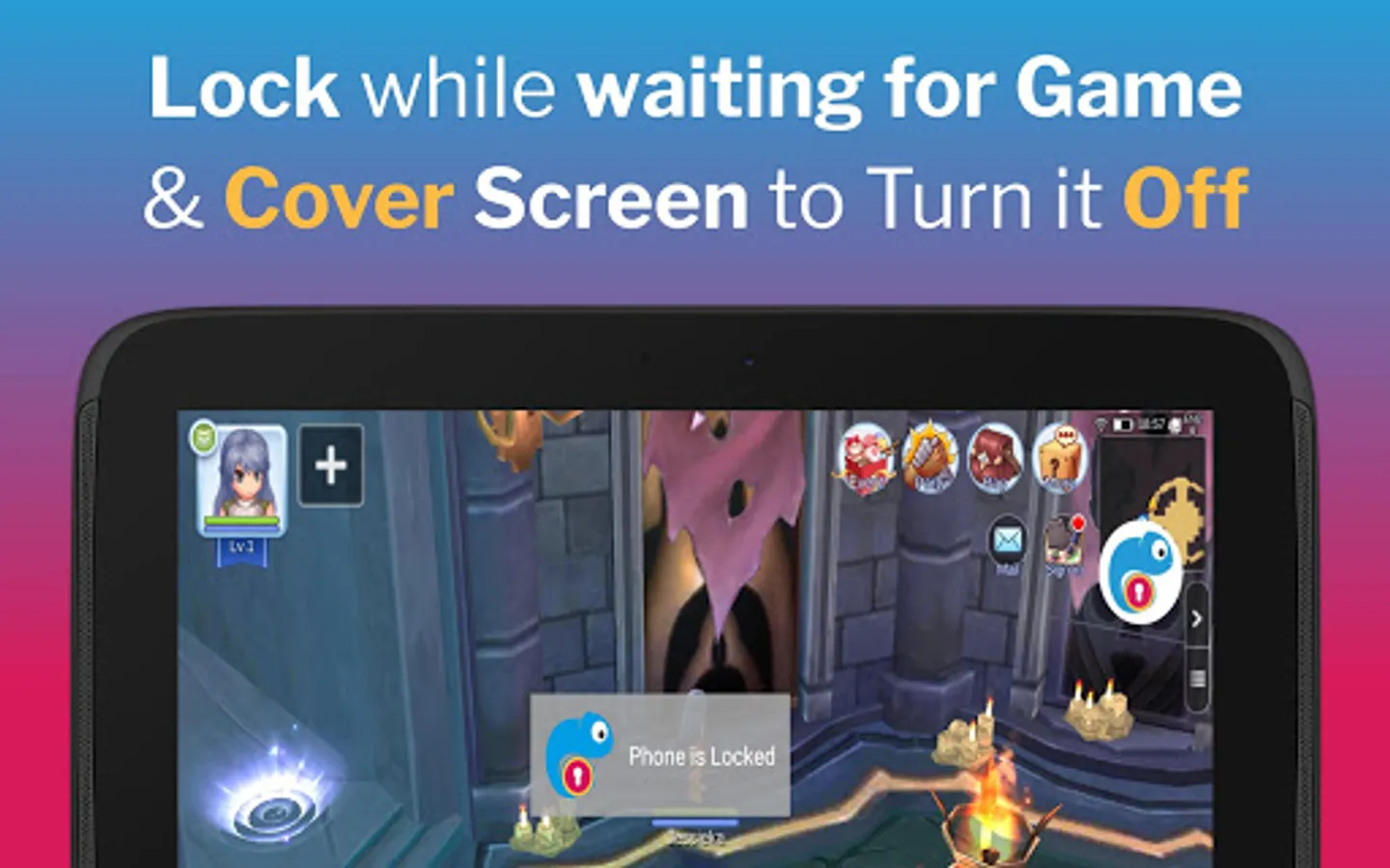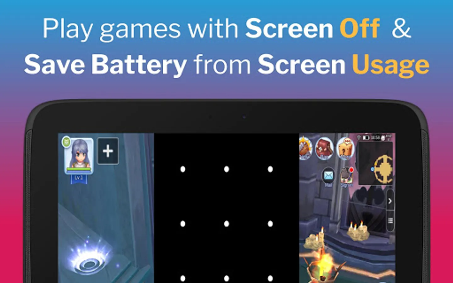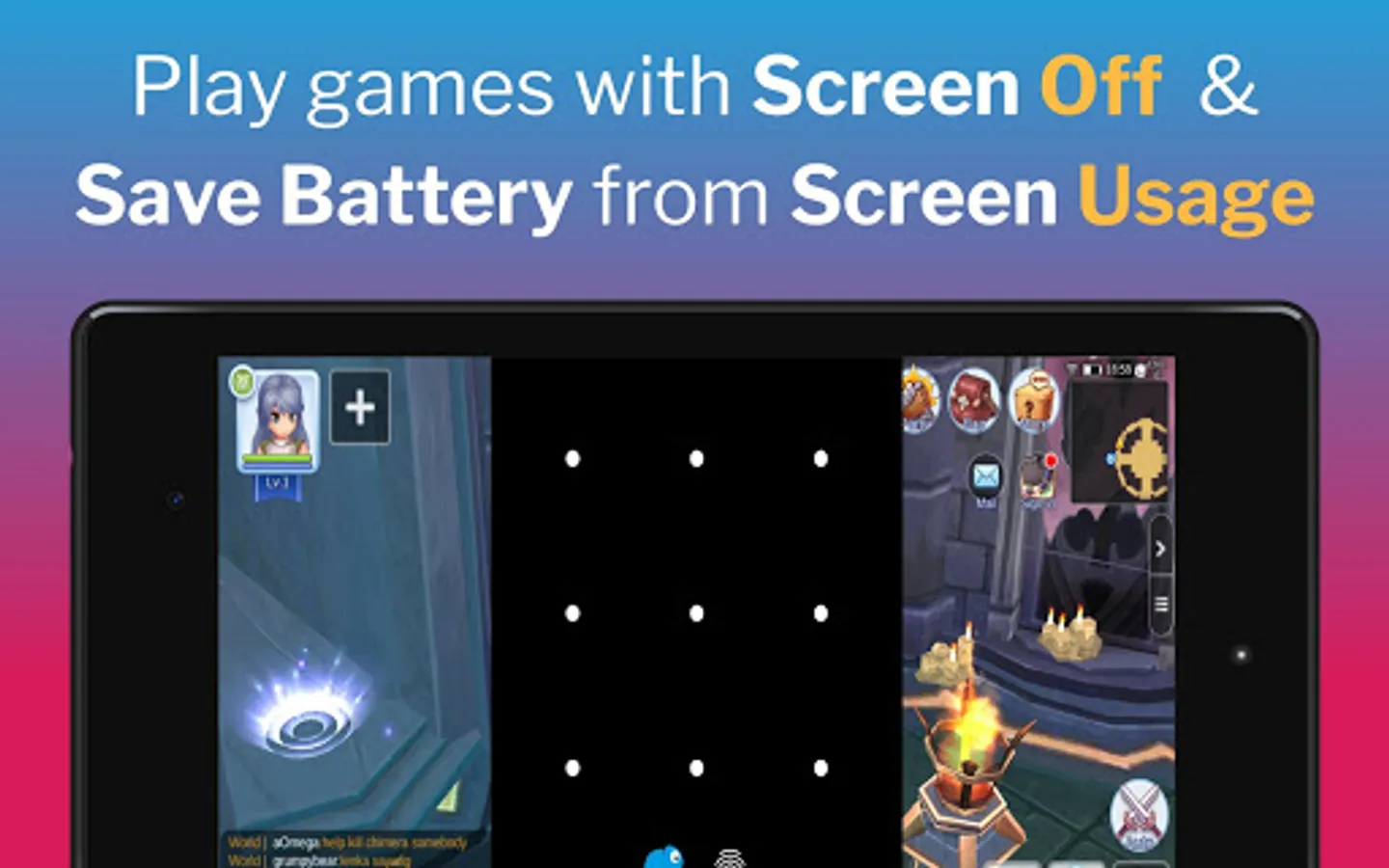 🏆 Boost game battery performance for all kinds of games like Augmented Reality, Simulations, MMORPG, RPG, MMO games, Adventure. Save battery from screen time when you do not need to look at the game, like when you are auto farming in Ragnarok M Eternal Love or hatching eggs in Pokemon GO.