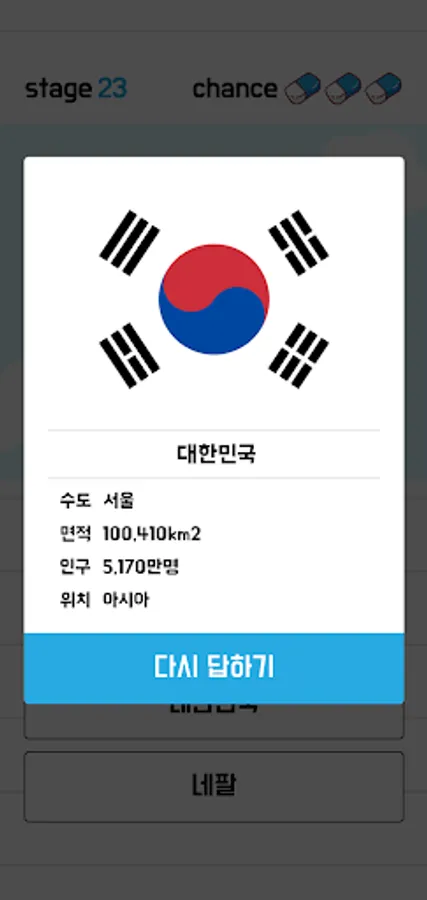 If you are wrong, you can check the country name, capital, continent, area and population along with the flag.