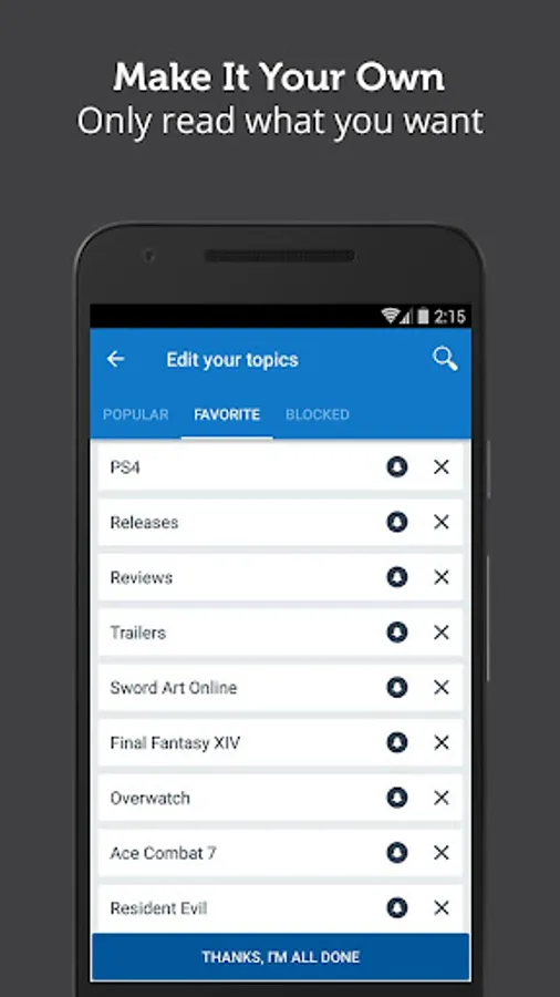 - Your very own news feed - choose the topics you want to follow or block the topics that you don't want! Don't bother yourself with news that don't interest you!