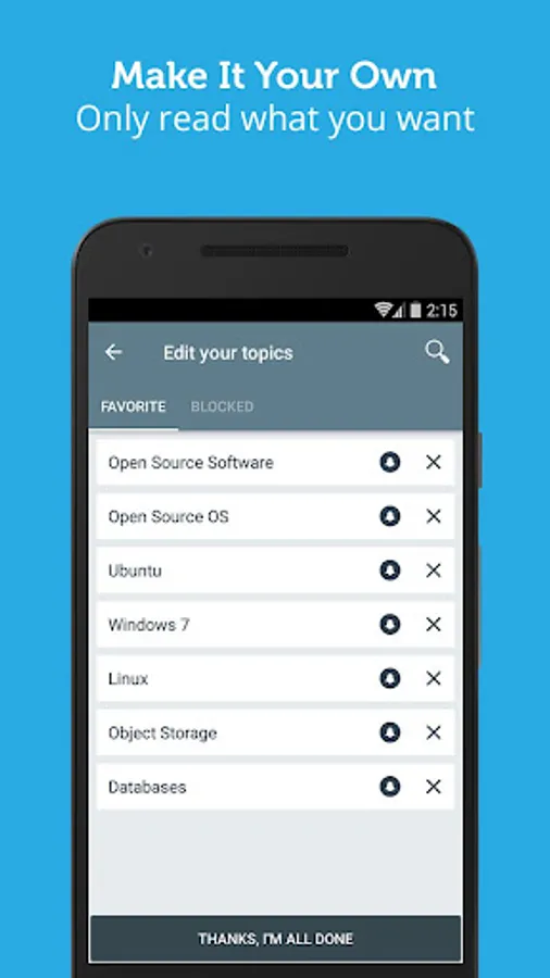 - Topics management - choose your favorite topics (like "Debian" or "SQLite"), block certain topics and choose the topics you want to get notifications about