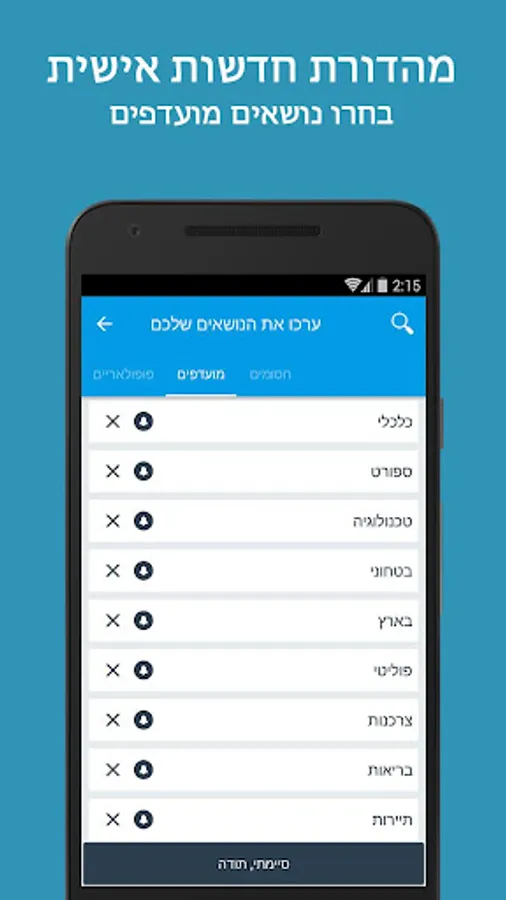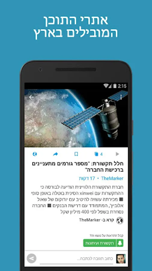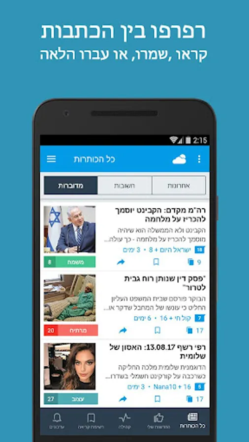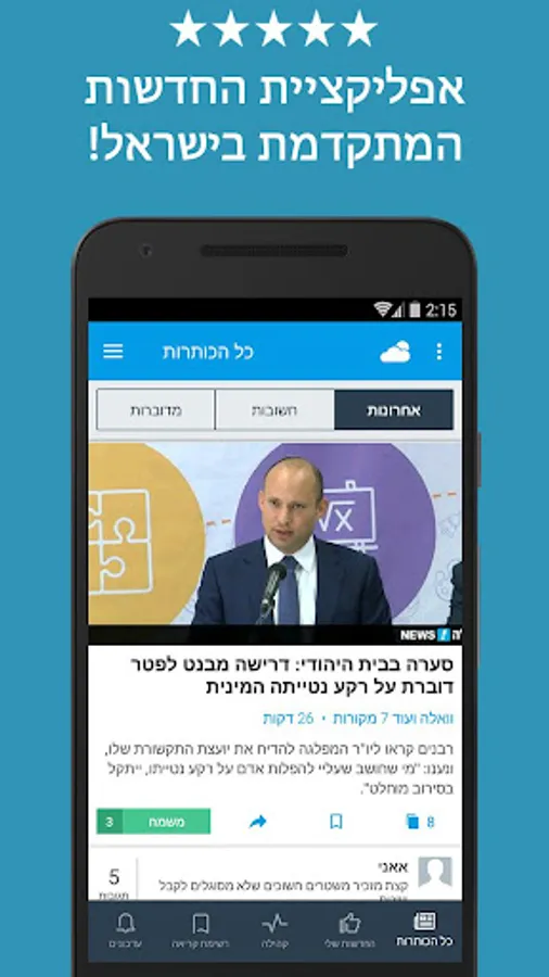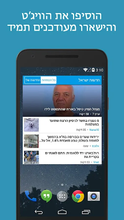 The app will present you with the most important news from all news sites sports economy technology consumerism Jewish culture and more. Among the sites included - Ynet, Mako, Walla, Israel Today, Haaretz, The Marker, 0404, News 2, Calcalist and more!