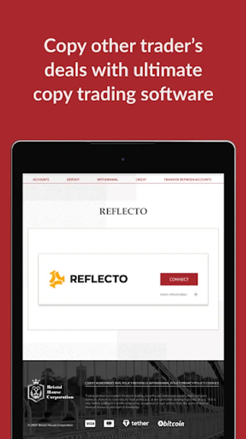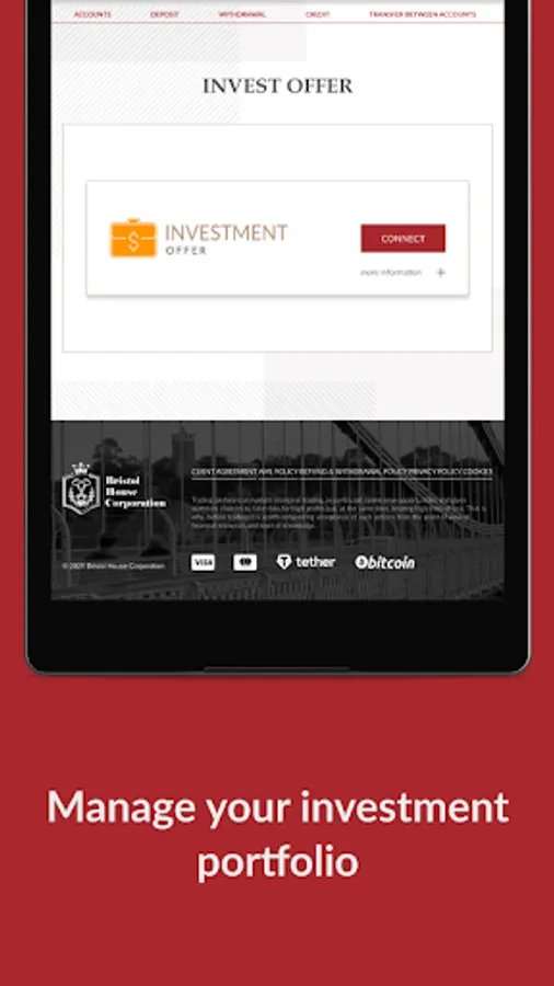 At Bristol House Corporation you have the freedom and luxury to invest exactly the way you would like. That is why we have no limitations on the size of the leverage. You can choose from a wide range of stocks, bonds, CDs, CFDs and various other options (we have more than 6 000 tools at your disposal). All tools are available online in one account.