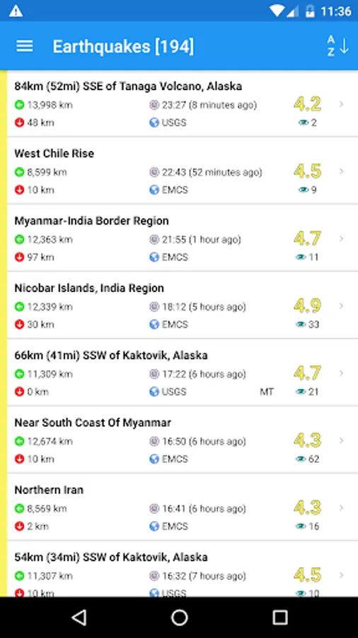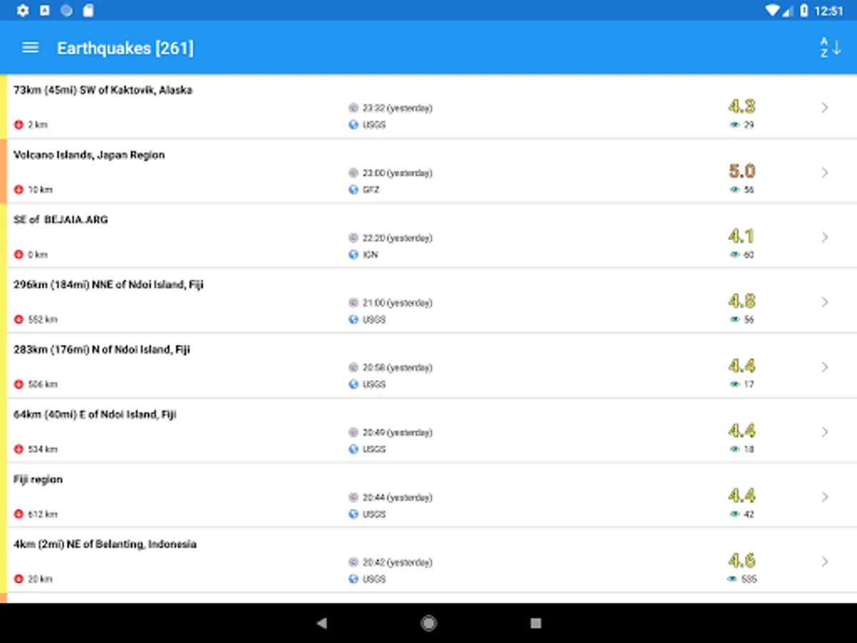 The app shows earthquakes for the whole world and for the locations of your interest.