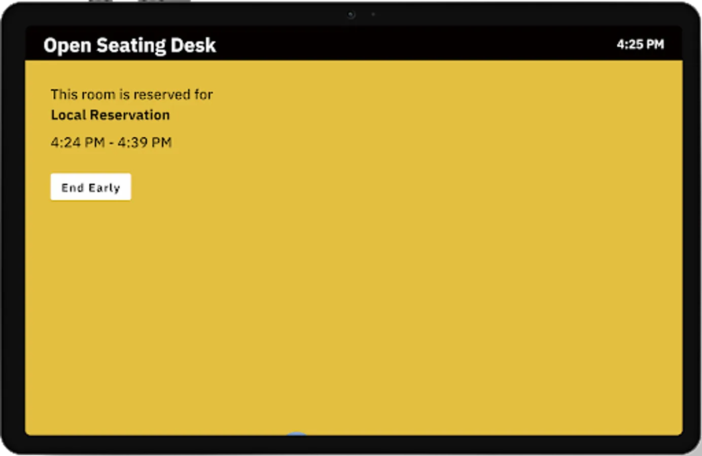 Place a second tablet inside a conference room to remind your users to check in, how much time they have left and even allow them to book additional time. Friendly audio prompts ensure that no one accidentally stays longer than their reservation allows.