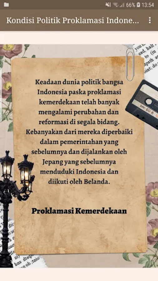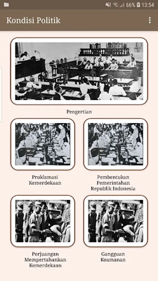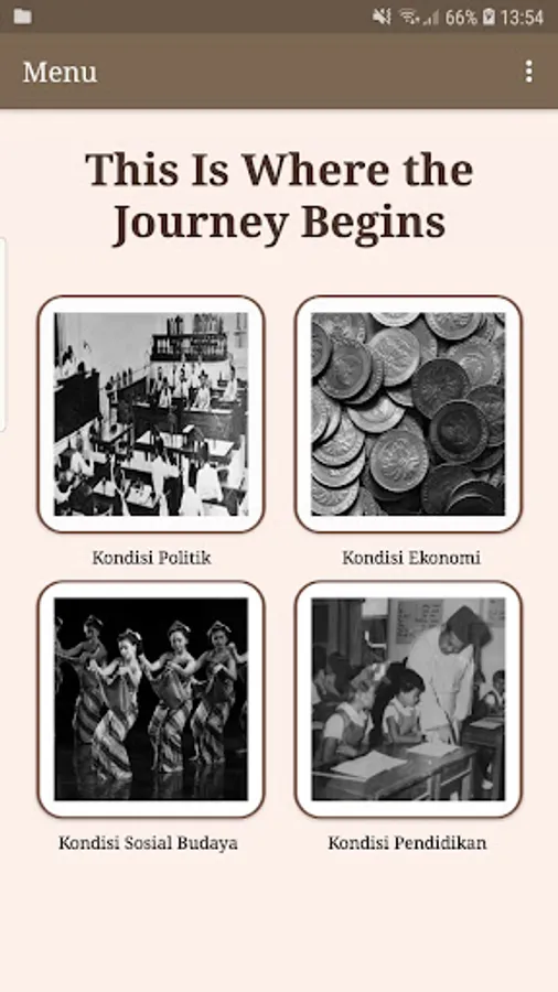 Berliana and Gabriela S. created and developed a history learning application about the early days of Indonesian independence. It explains the four main problems at that time, namely: economic conditions, political conditions, social and cultural conditions of the Indonesian nation in the early days of independence.