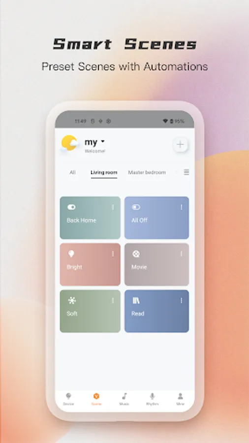 Various scenes are ready to use for each default room after devices are assigned. The new scene switch is also out-of-box for use matching preset scenes.