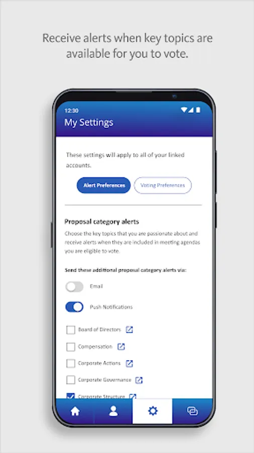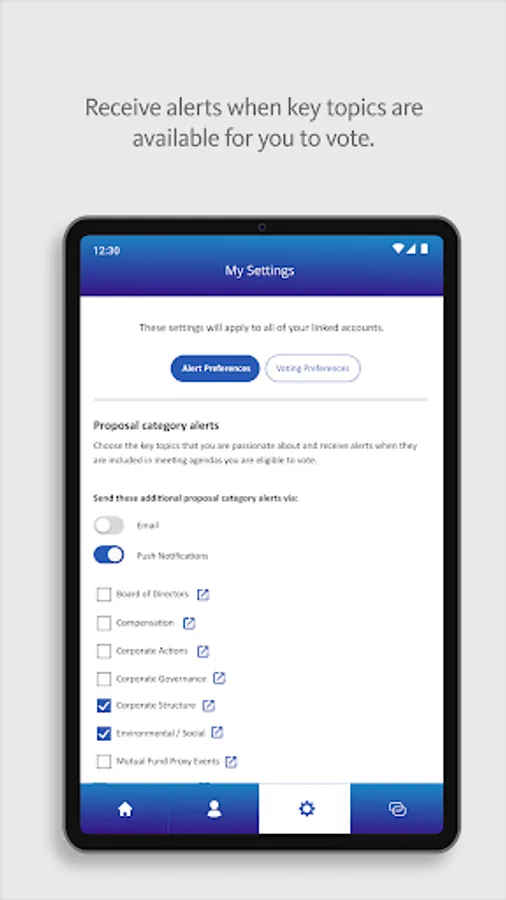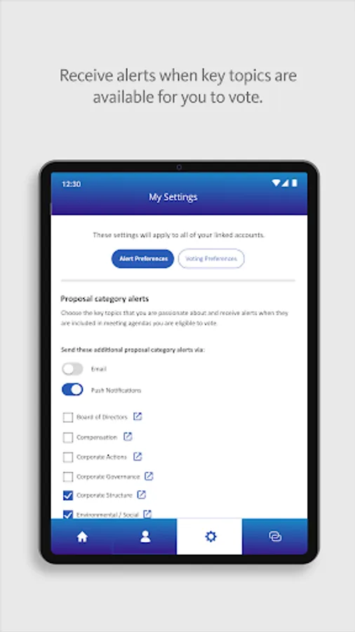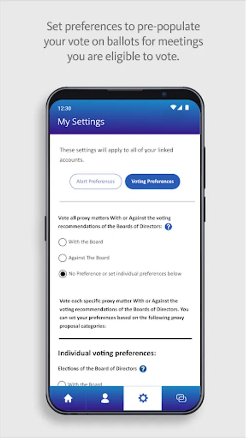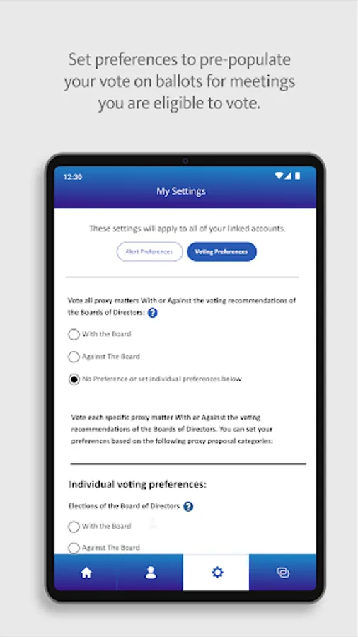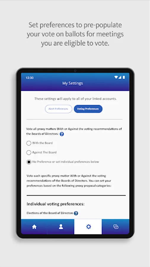 • Set preferences to vote With or Against the Board of Directors on every proposal or selected proposal types. Your preferences will be used to pre-populate vote selections on meetings you are eligible to vote, but you can always make changes before submitting.