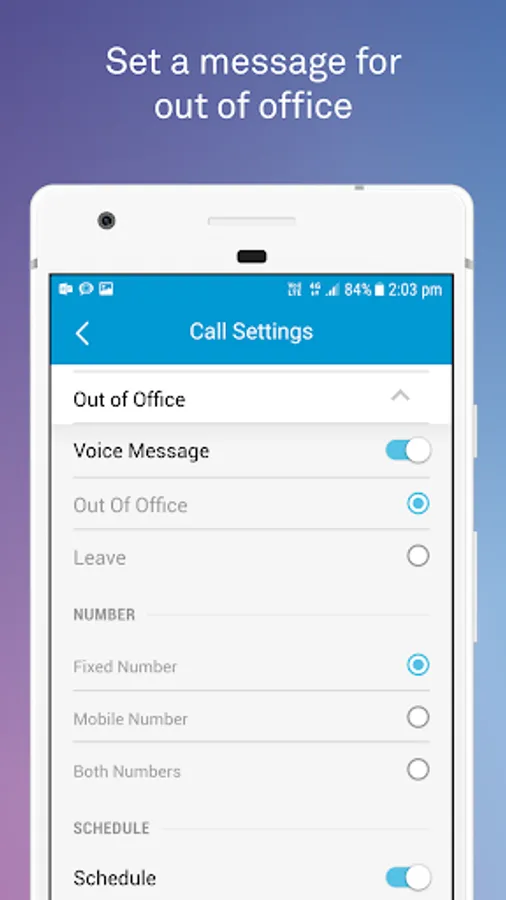 * Choose a pre-recorded voice message when you're unavailable (out of office).