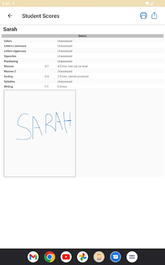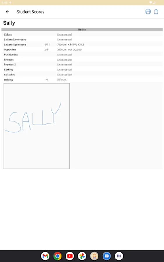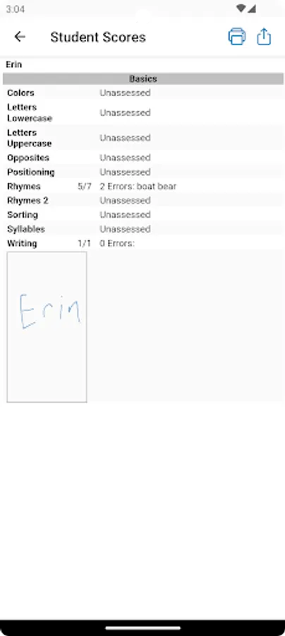 Assessment types include: colors, uppercase letters, lowercase letters, rhymes, opposites, positioning, sorting, syllables, handwriting, letter selection, begins with letter, reading, site words, blends, shapes, 3d shapes, numbers 0-100, patterns, sizing and counting.