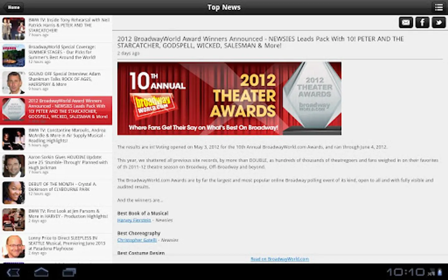 BroadwayWorld.com's brand-new Android app provides the full editorial content of the largest theatre web site in the world including breaking Broadway news, photos, videos, top stories, special Broadway offers, reviews and extensive coverage of theatre.