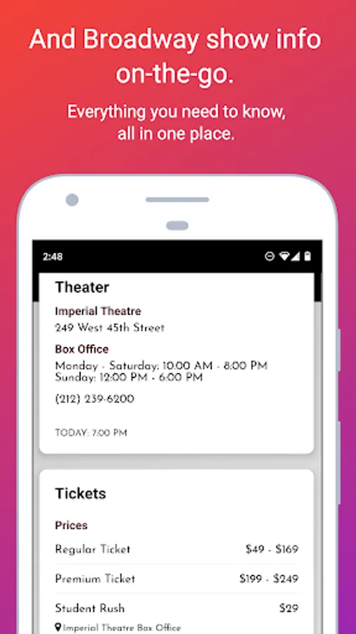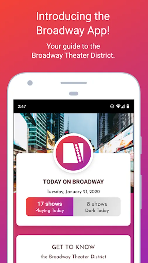 Welcome to the new Broadway App! Your guide to the Broadway Theater District. Now it’s easier than ever to find showtimes, theater locations, ticket pricing, and other information -- at home or during your visit to Broadway.