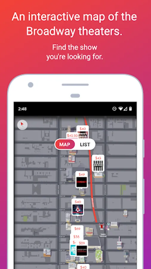 -- Use the interactive, GPS-enabled map to explore the Broadway Theater District and easily see the theaters and shows nearest to you.