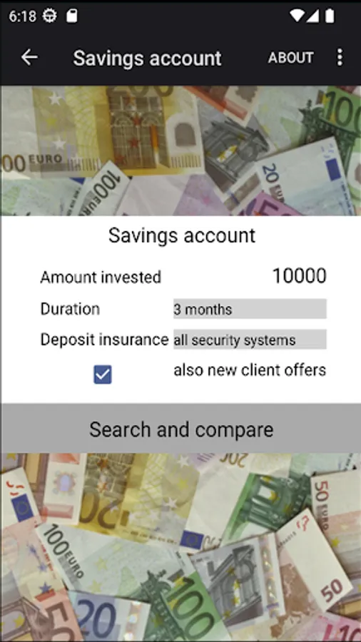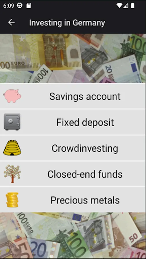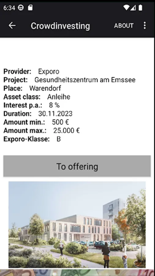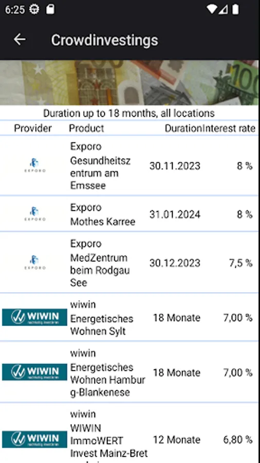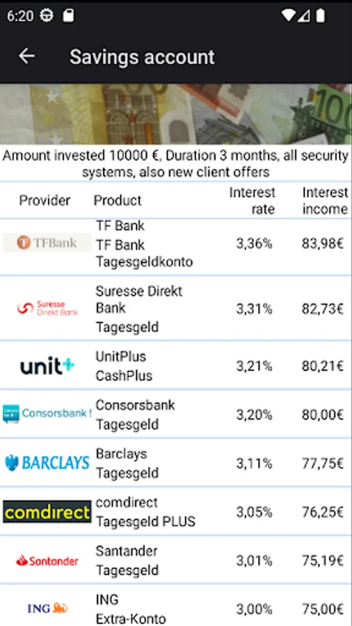 The app lists current investment products from banks and fintech companies in Germany that are currently on offer.