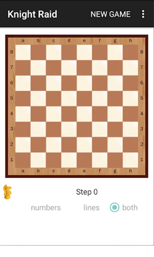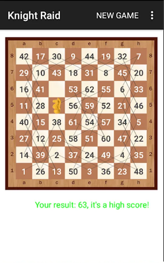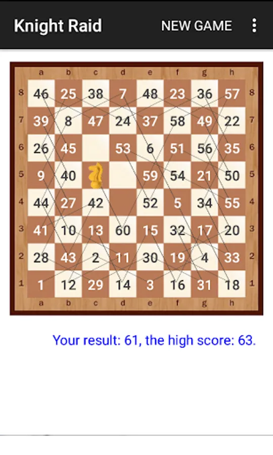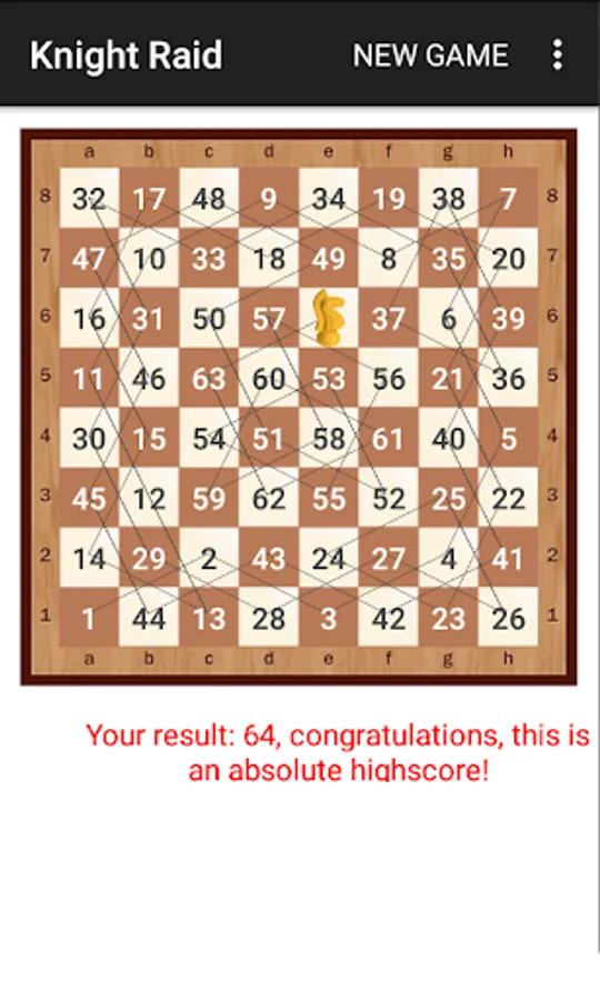 Initially the board is empty. First click on the board to put the knight on a starting field, then move it from there to the next desired field (or click on it). Try making as many moves as possible. Individual highscores are stored (storage can be reset via the menu). The absolute record is, as you may guess, 64.