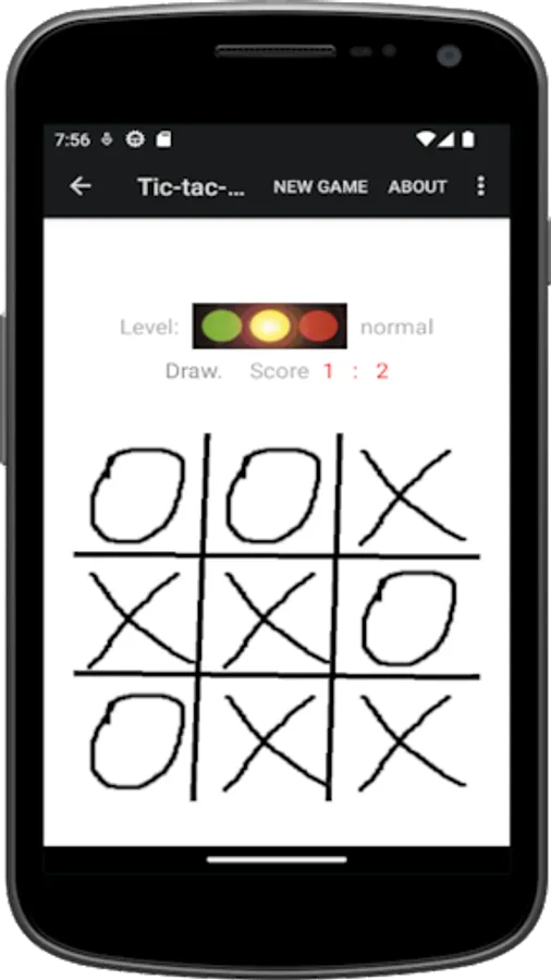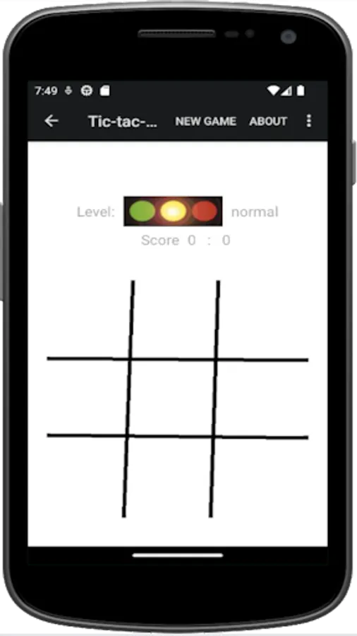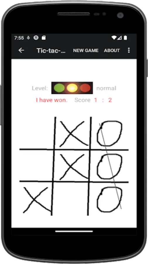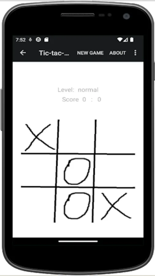 The player (X) plays against the Android App (O). The two players place their mark alternately on a 3 x 3 squares wide playing field. Who sets the first three of his characters in a row, column or main diagonal is the winner.