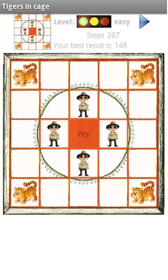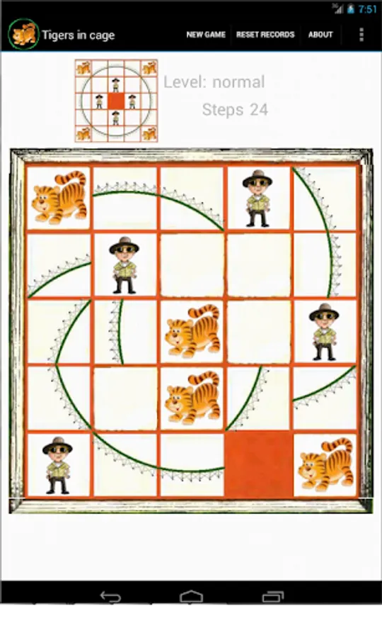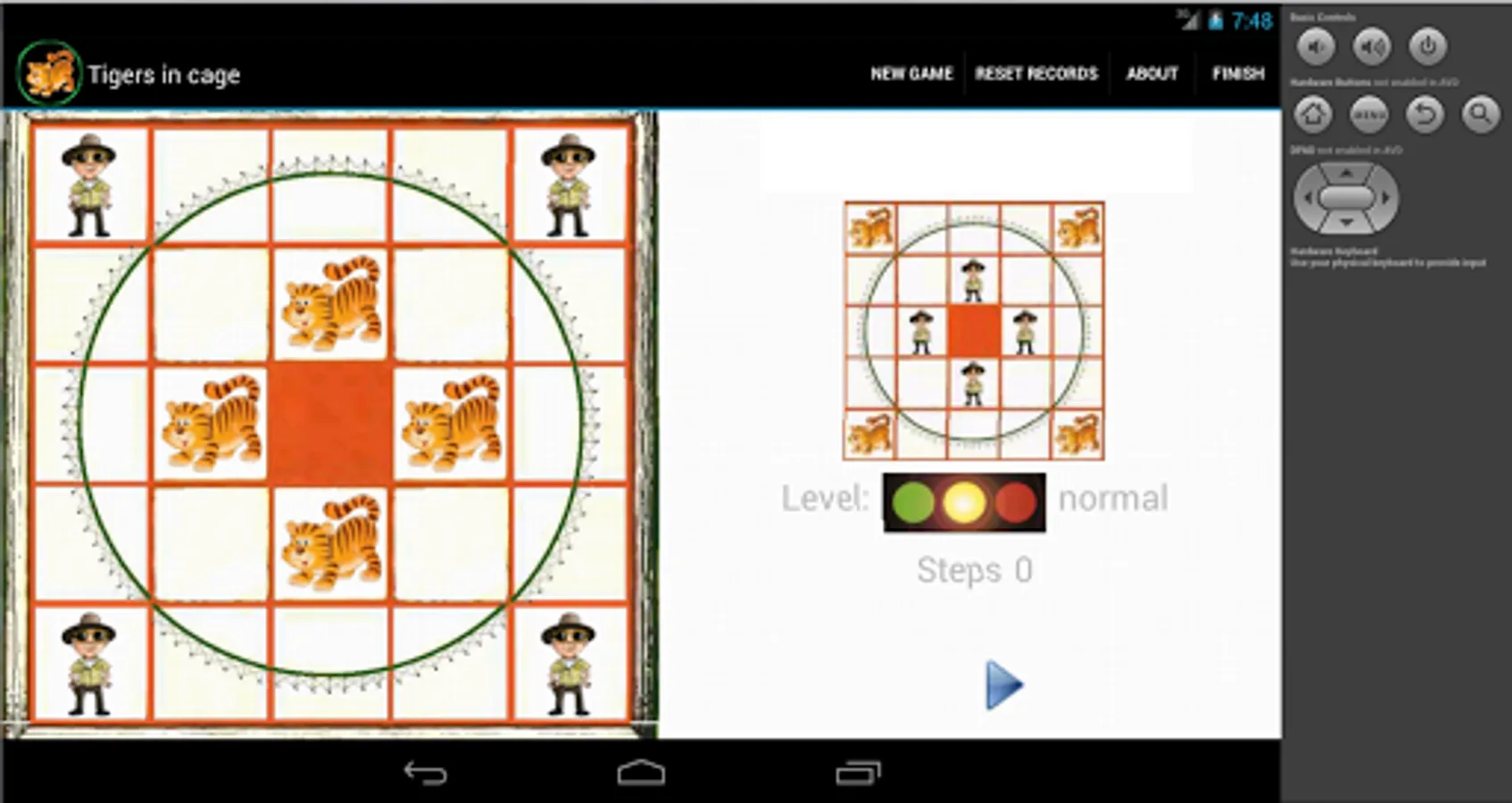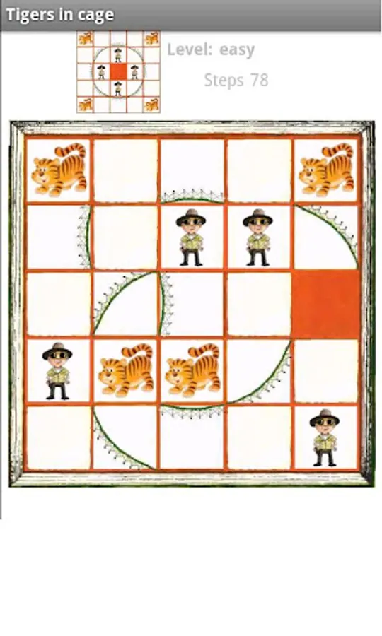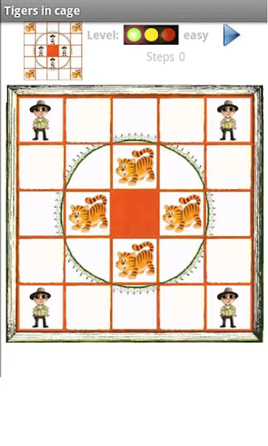 Three levels (easy, normal and hard) depending on the lattice configuration - the more empty tiles the easier it is to solve this puzzle. It is required to achieve a position in which tigers and security guards interchanged their positions, and the empty place remains in the box center. The target position is visible on a small picture above or to the right of the playing field.