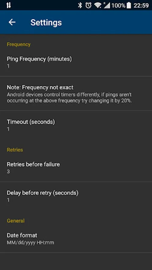 - Ping frequency in minutes (note: this is not 100% accurate as different devices monitor background activities in their own manner, sometimes delaying background executions. If your ping schedule is not accurate according to the frequency you selected, change the frequency by about 20%.)