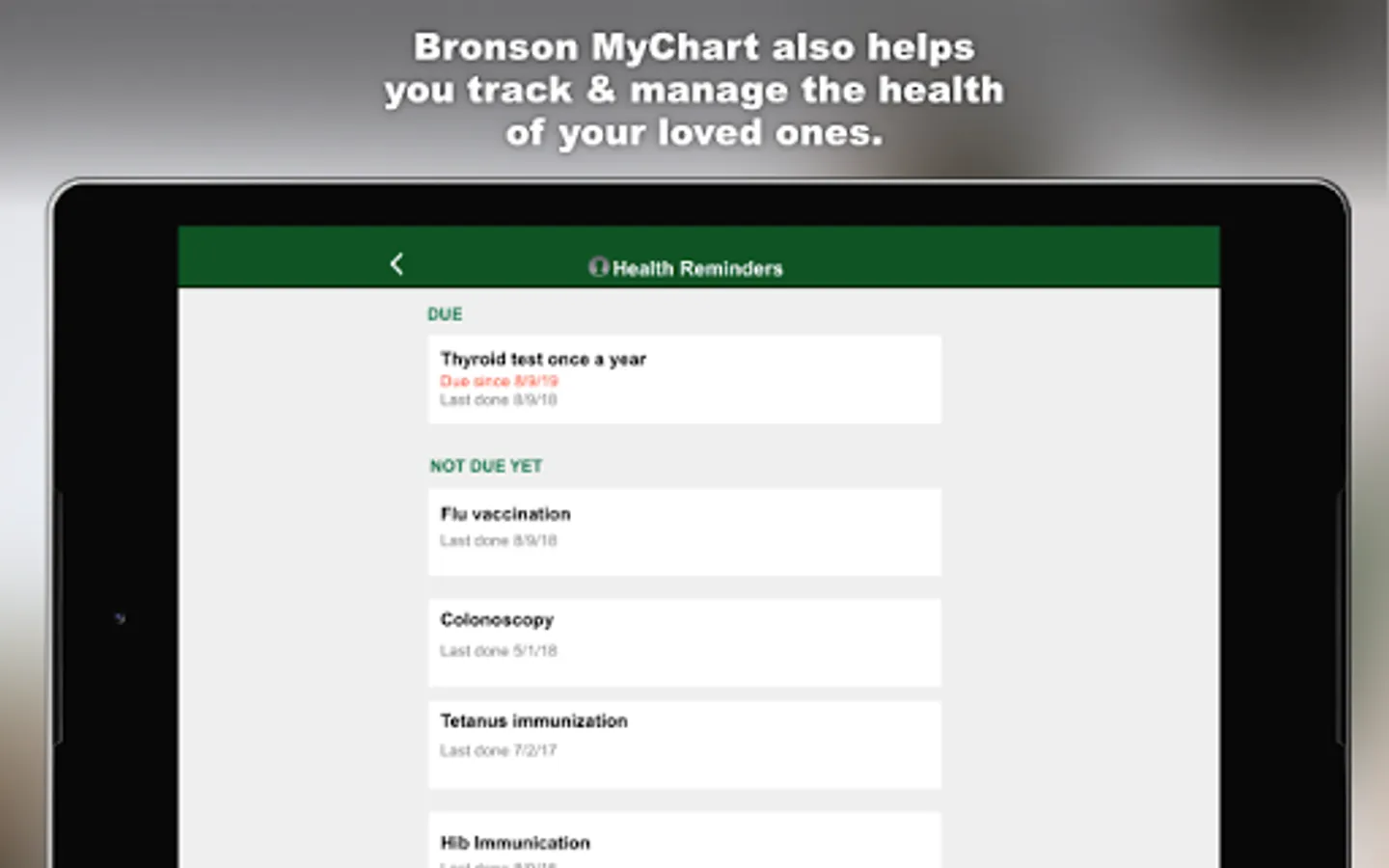 Bronson MyChart is a secure online connection that allows you to access your electronic health information, and by proxy, your family’s health information, from any computer, tablet or smart phone.