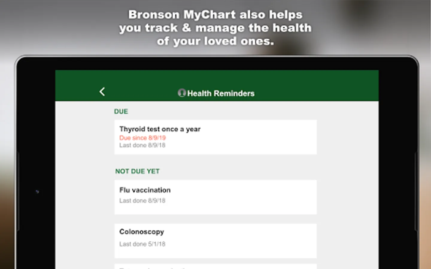 Bronson MyChart is a real time saver and an easy way to stay on top of your health. You can use Bronson MyChart at any time to: