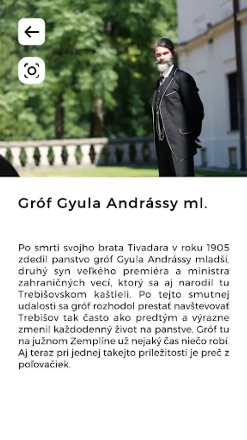 Augmented reality Life on the manor is a virtual exhibition of the Trebiš Museum - Andrássy Manor. Download the app and find the lost Countess Katinka Andrássy on the former Andrássy estate. You will be assisted in this by 7 panels located in the museum area and 11 people who, in addition to taking you to Countess Katus, will tell you how they live with the count's family.