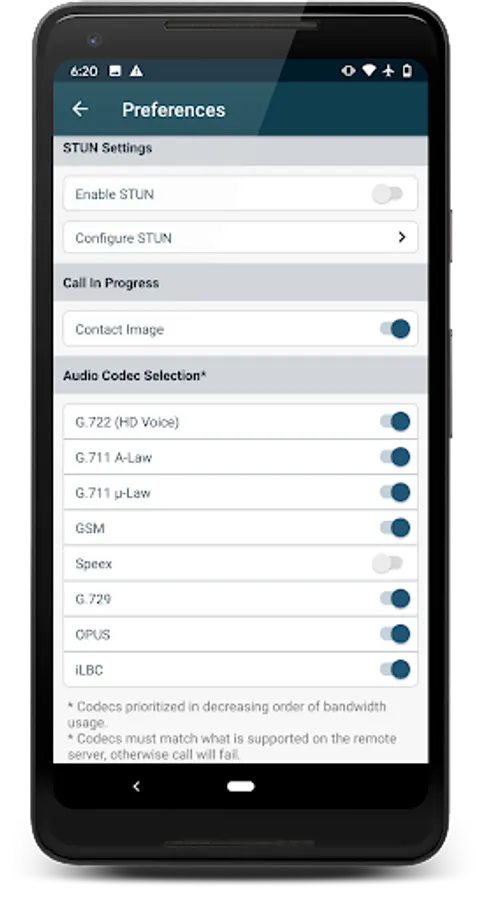 - Audio codecs include G.722 (HD), G.729, G.711A/U (PCMA/PCMU), GSM and OPUS