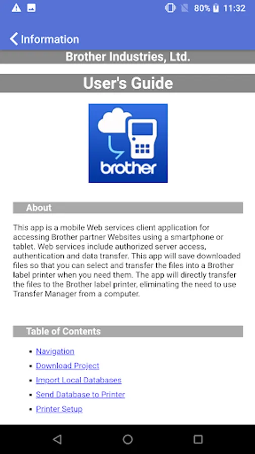 This Brother app is a mobile Web services client application for accessing the Fluke Networks LinkWare™ Live cloud software service using a smartphone or tablet. This app will save downloaded projects so that you can select and transfer them into a P-touch EDGE® model PT-E550W industrial label printer when you need them.