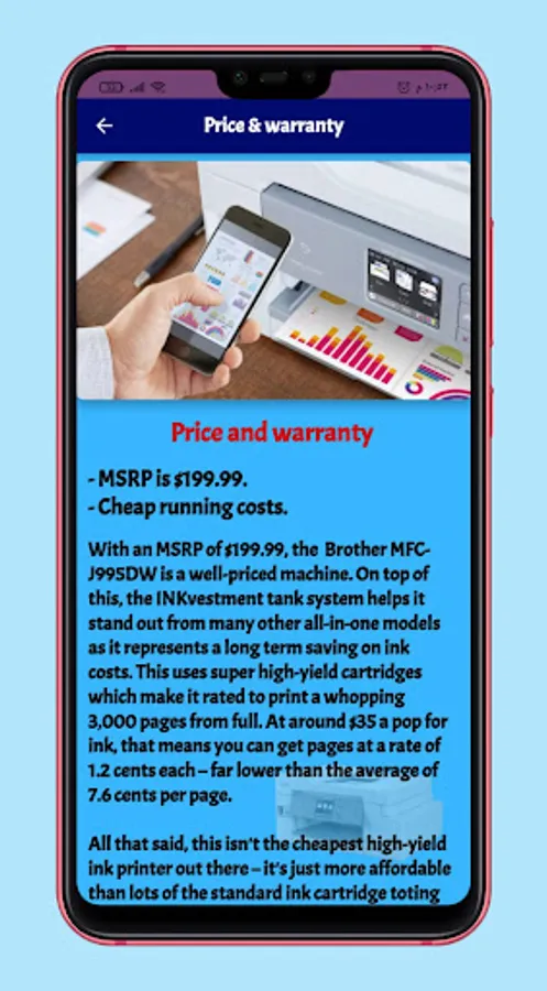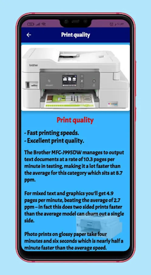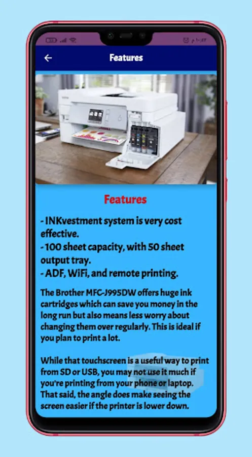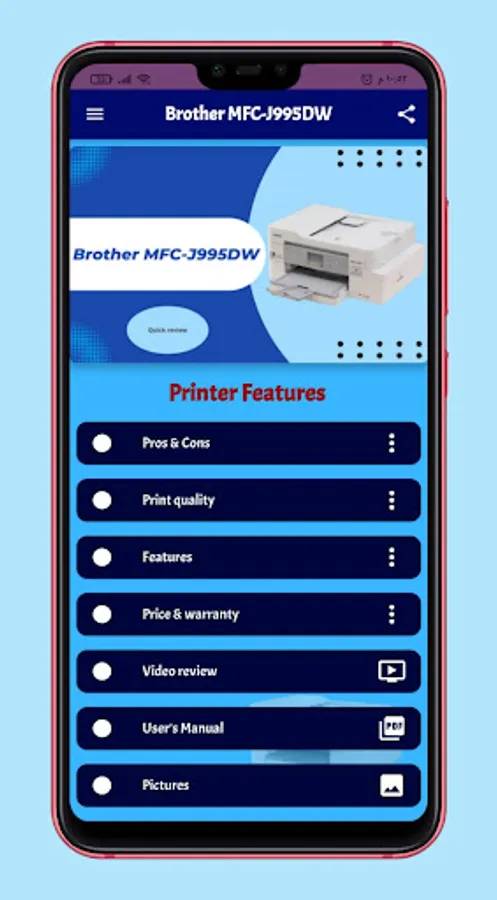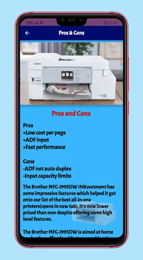 The application includes a review of the Brother MFC-J995DW guide video to teach the control of the printer. Through the application, the MFC-J995DW guide, you can learn about all the specifications and advantages of the MFC-J995DW