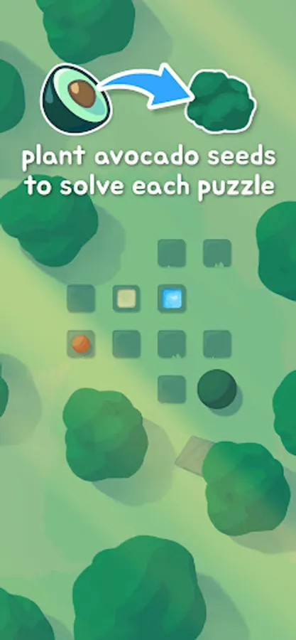 Use the 4 avocado piece-types and their unique sliding mechanics to plant all of the seeds into the soil and water tiles. Some seemingly easy levels will have you completely stumped until you get a very satisfying 'Aha!' moment where you find the solution.