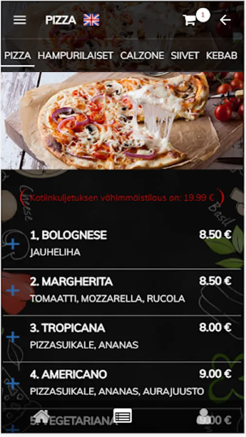 pizzat suoraan listasta, erilaiset valkosipulileivät tai extratäytteet ja annoksen kylkeen valittava juoma – tai