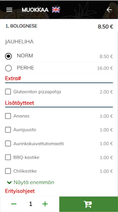 Valittuasi halutun ruoka-annoksen, lisäät sen ostoskoriin – tai valitset esim. lisätäytteitä. Voit tehdä vielä