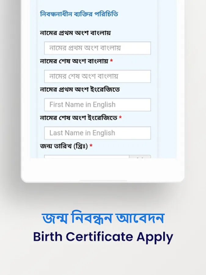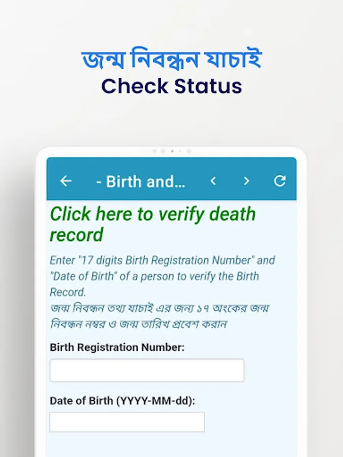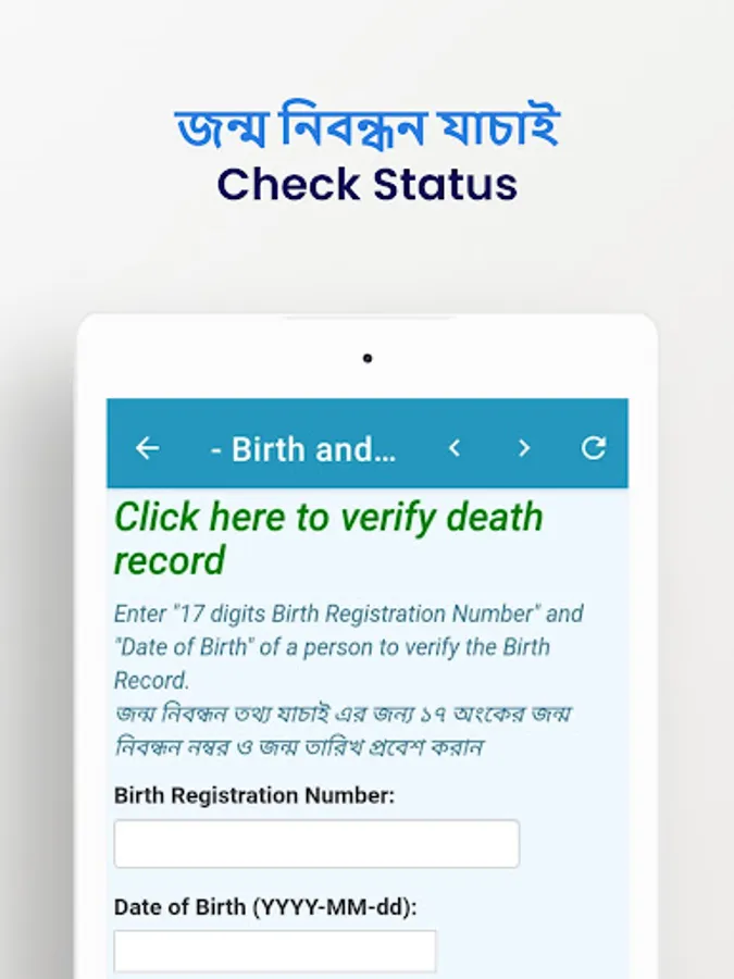 Disclaimer: We are not affiliated with the website used in this app. We don't provide any information about this service directly, We just embed the websites (https://bdris.gov.bd/) to easily access. The contents of this application are available on public domains. For any kind of content removal request, contact us via our developer Email, and we will look into your concern and take action from our side as soon as possible. We don't claim rights to any content in this application.