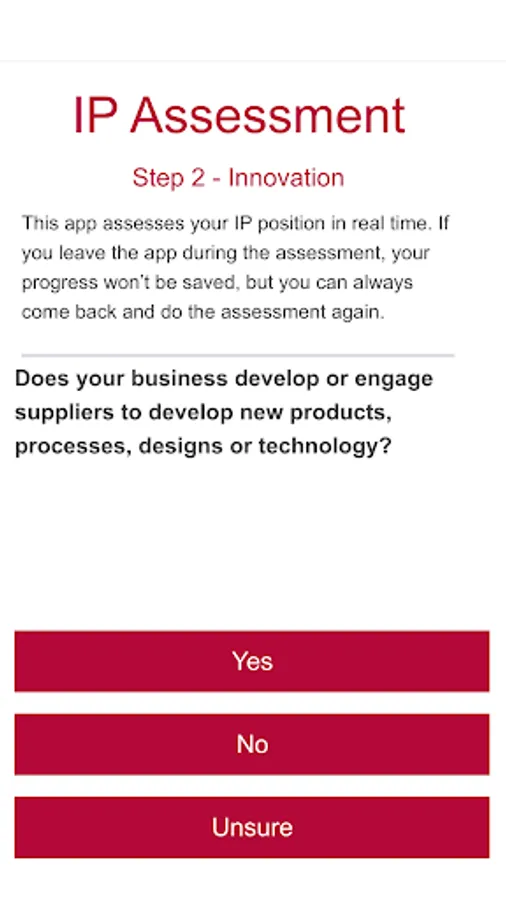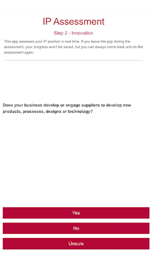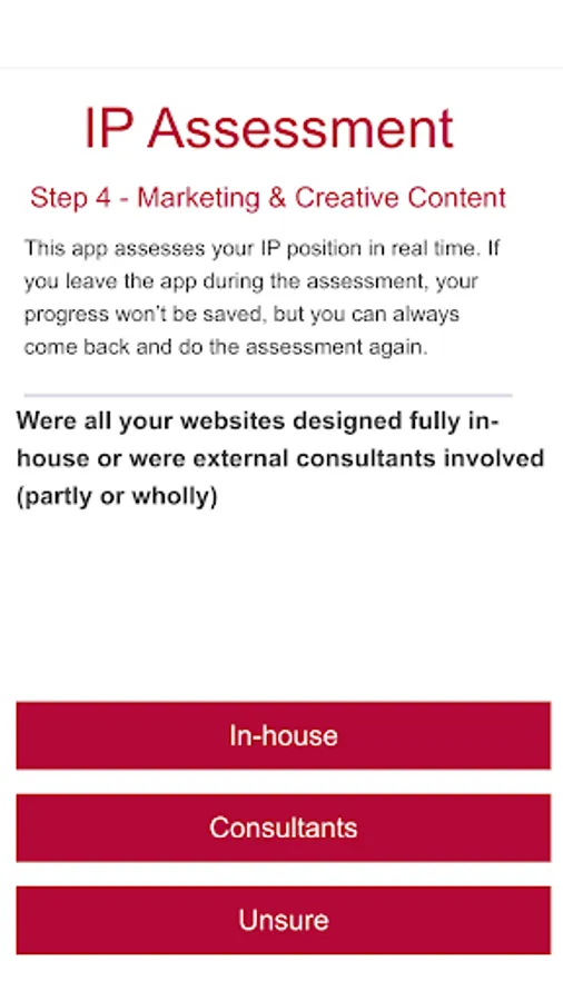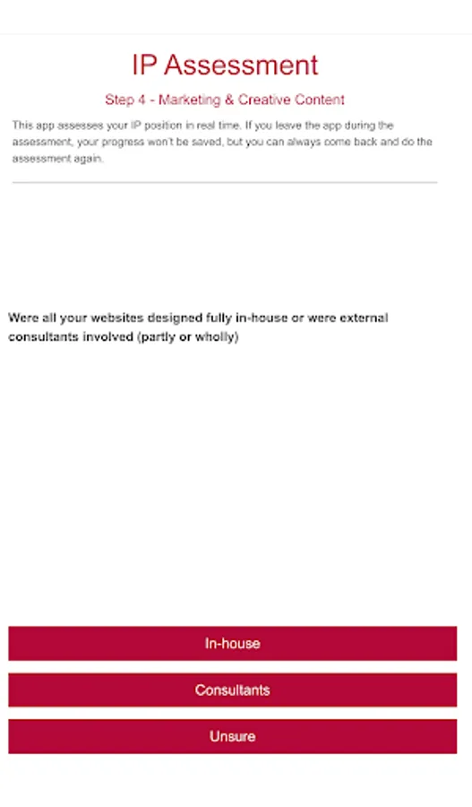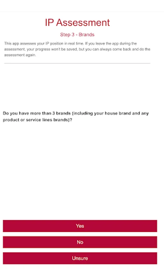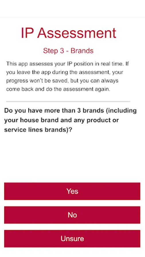 The app works by asking a number of high-level questions about your current IP situation. These are the questions all businesses and non-profits need to consider when managing their intellectual property.