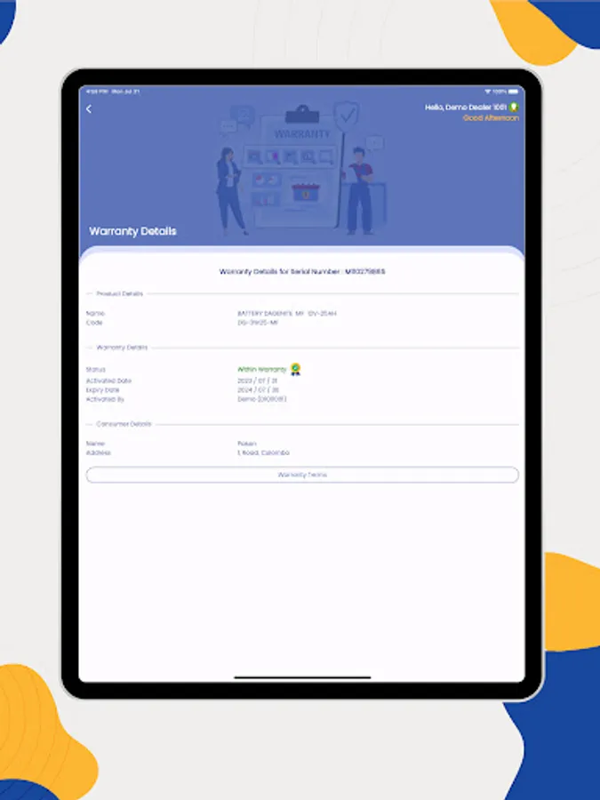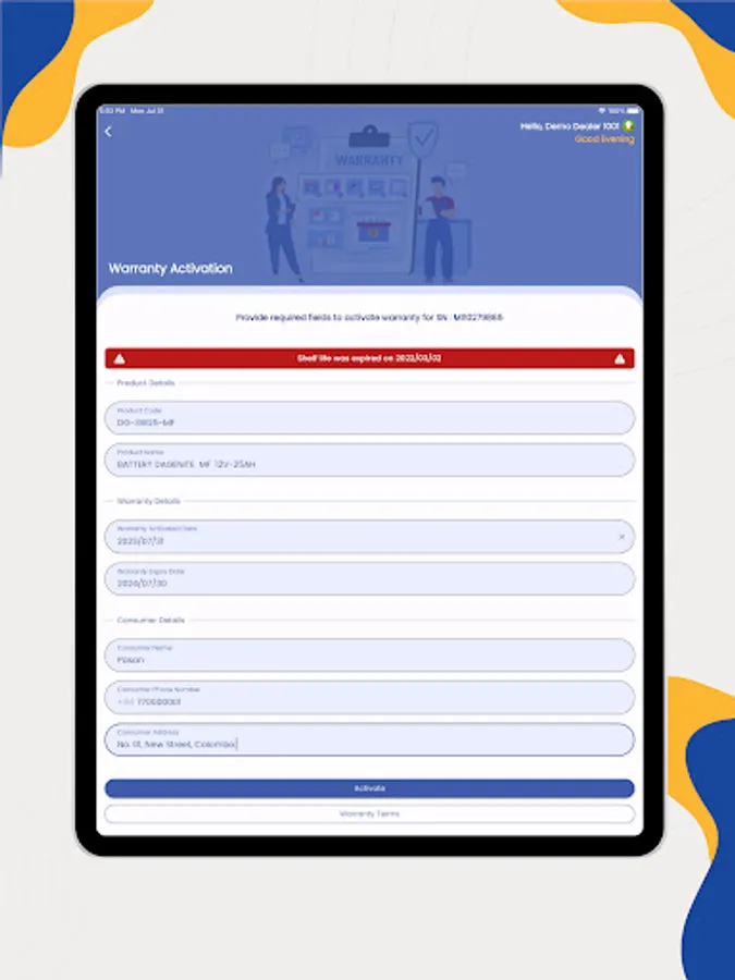 The primary users of this application are dealers, and they have access to various essential features. They can activate warranties, check warranty details using serial number, phone number, or vehicle number, and also, submit warranty claims. To ensure streamlined operations, dealers are linked to specific products from the web backend, allowing them to perform activations only for the mapped products.
