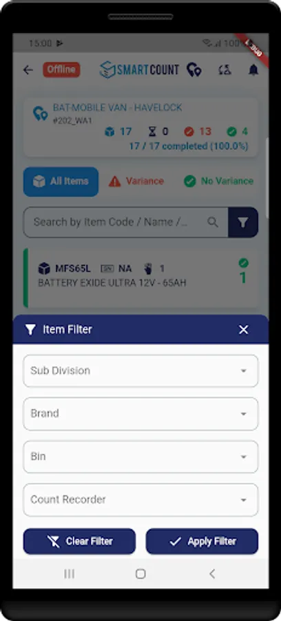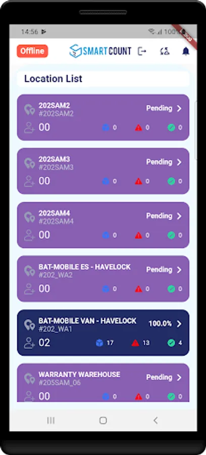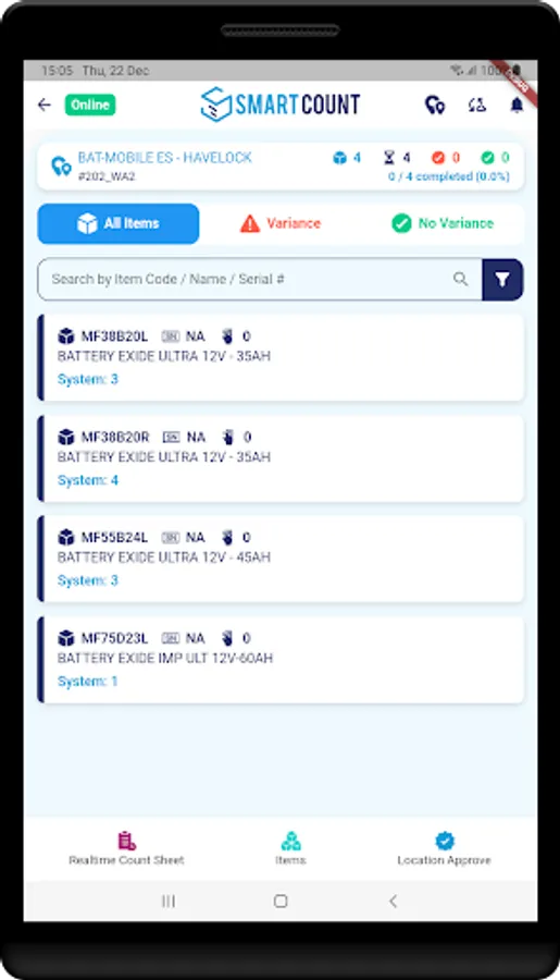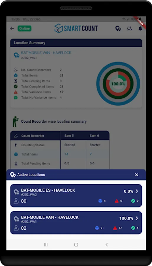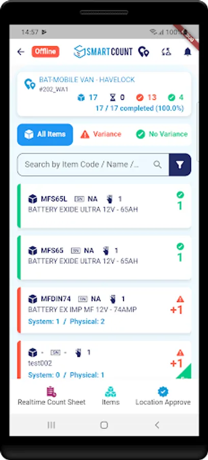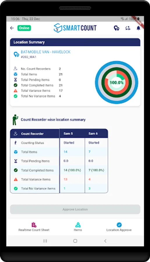 At a given time, Count Recorder can start only one location whereas Warehouse Officer/Third Party Observer/Auditor can start multiple locations at a given time. Warehouse Officer/Third Party Observer/Auditor can switch the location and view the current update of each location. Also, a separate view is available for Warehouse Officer/Third Party Observer/Auditor to view all the variance items of all the active locations. Non-variance items are displayed in Green color and variance items are in Red color display in the screen.