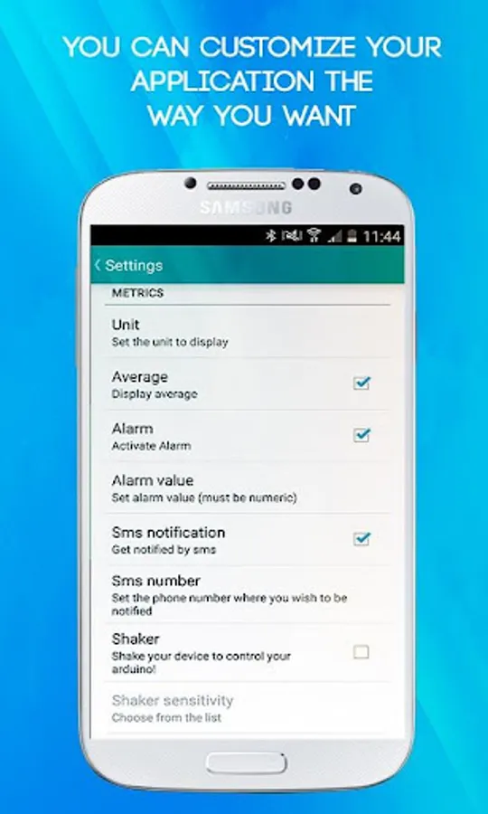 This tool was optimized to receive data via the println () function of arduino, which allows special processing of the data received, like in the "Metrics" tool. It allows you to receive only numbers and fix alarms to get notified about the variations of the value received.Once the alarm triggered, a stop button shows up, allowing you to stop it.Besides you can activate the shaking mode, that will allow you to send data simply by shaking your phone.