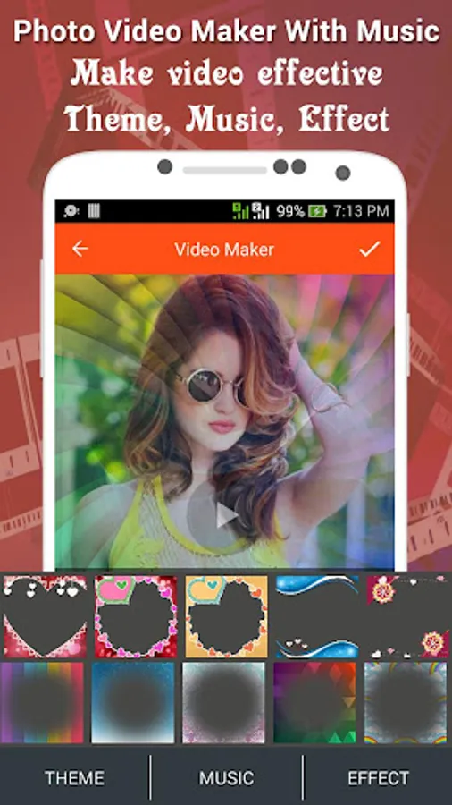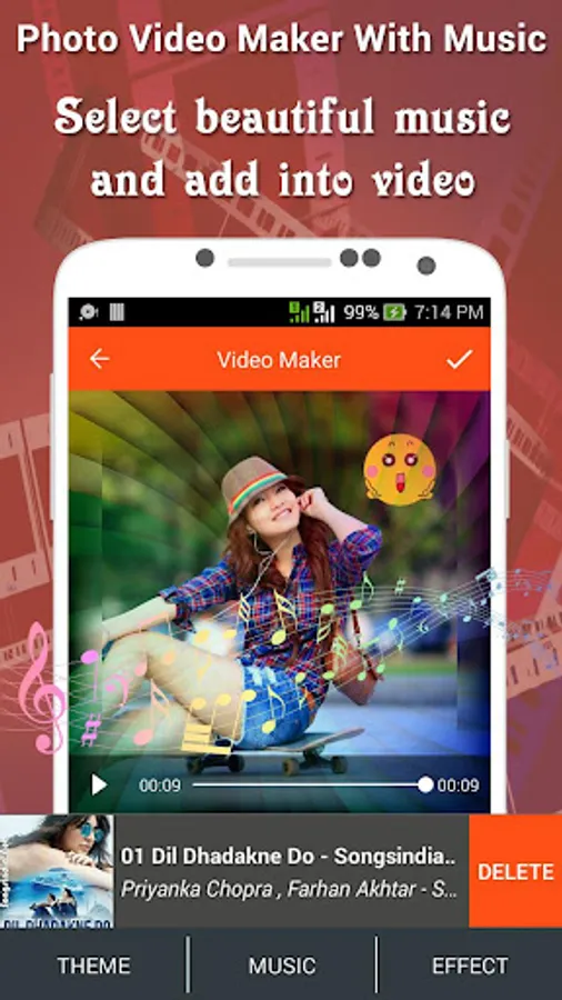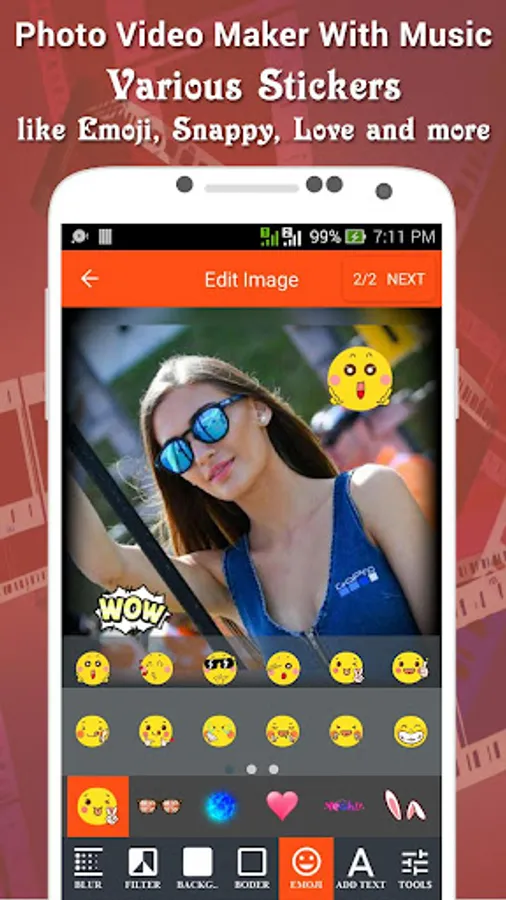 Photo Video Maker With Music have photo editor with features such as filters text and a variety of funny emojis stickers. You can add the stickers on your photo.