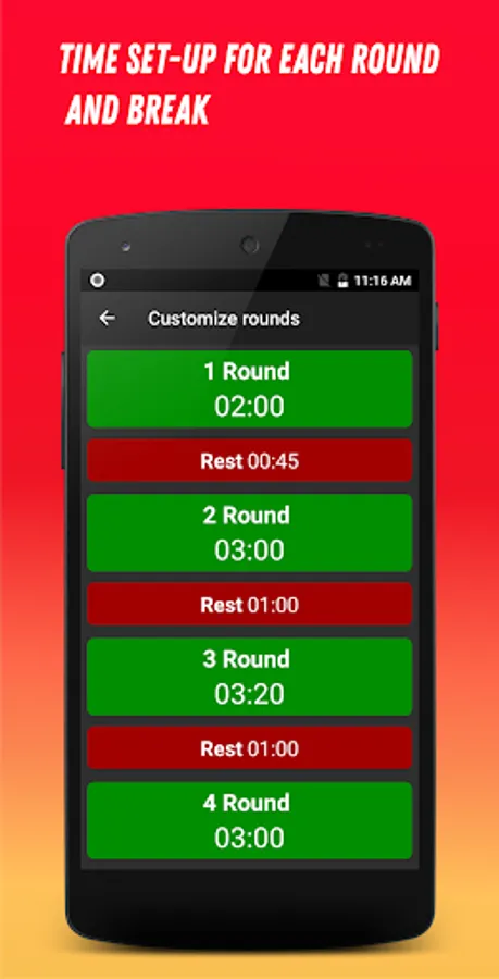 Awesome Boxing Interval Timer App is awesome. Well designed, with bright colour screen backgrounds for fighting round modes, resting, etc. Figures nice, big and bold for use on phones. Love the genuine bell sounds at start and of rounds and voice. Easy to change settings, great layout especially when phone is vertical / horizontal. App is also good for things like Tabata cardio workouts, etc. Sleek, simple, versatile and brilliant. Don't waste time getting the free version, f@x? the ads and get the pro if your serious!!