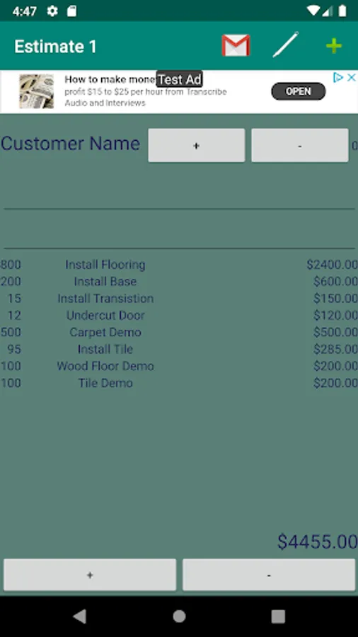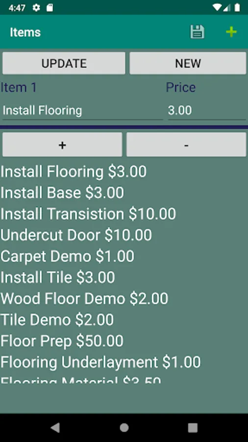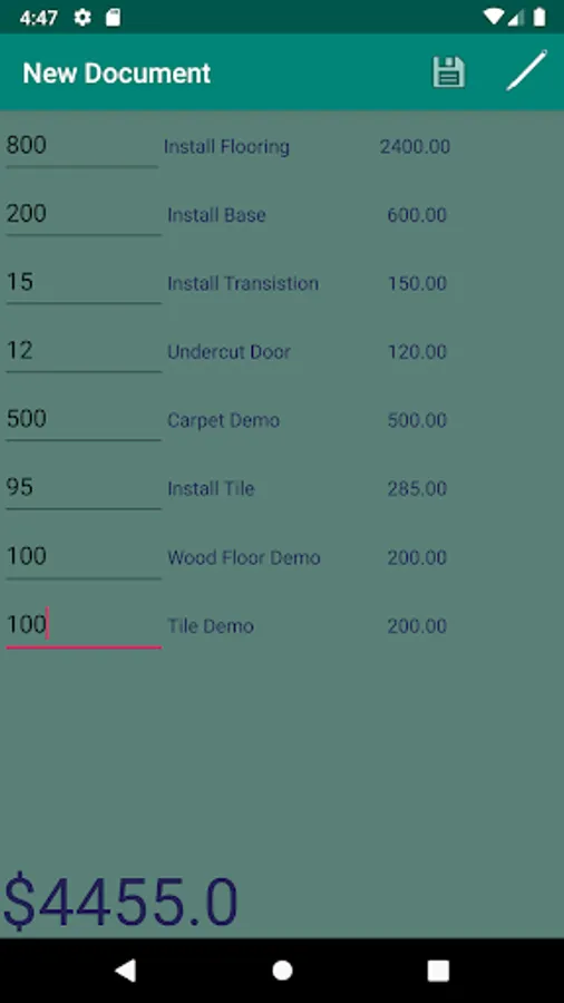 Create a Flooring Estimate,Invoice, and Measure that can be sent by email directly from app. Save your customers and their email, phone numbers, and addresses. Save Flooring Measures room by room and save Total Base Moulding, obstacles, transistions and Address for your measure. Save your prices for each item on Flooring Estimate, Invoice. Enter your Company Name, Number, and Email and will be added to the Email. This is great for sending a Tile, Wood Floor, or Laminate Flooring estimate on the go.