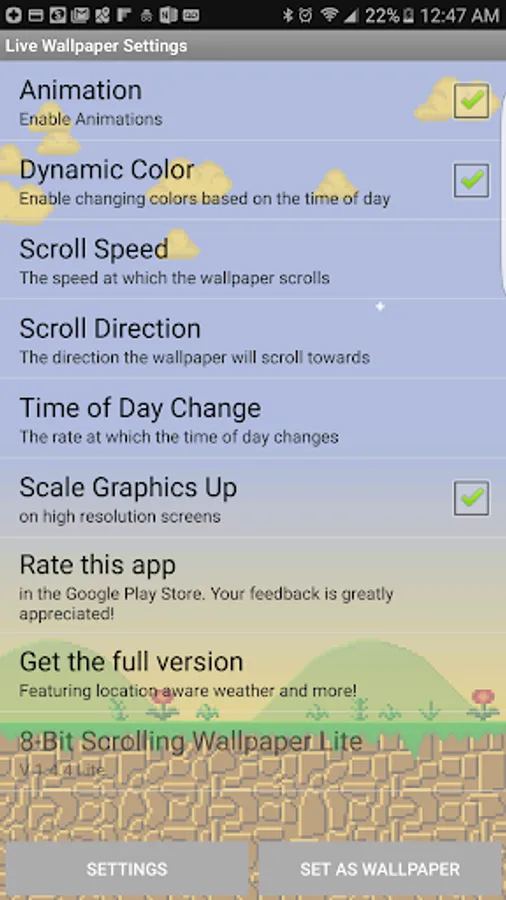 This wallpaper scrolls through 8-bit scenery, changing colors based on the time of day. The lite version is completely free, features no ads and requires no permissions... please enjoy this hassle-free 8-bit experience.