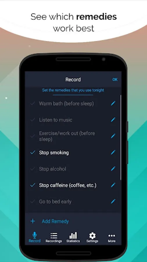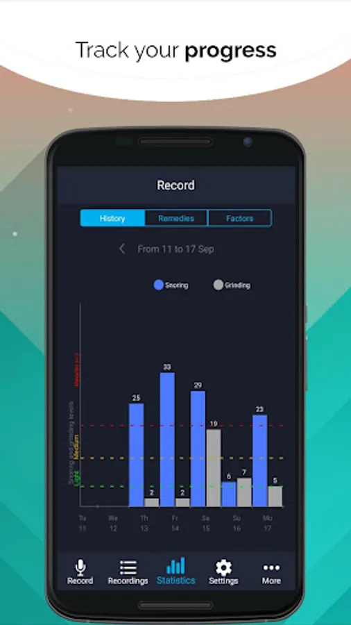 Compare the sound recordings with a remedy or factor with the recordings without any remedy or factor and see the difference yourself, by comparing the grinding and the snoring score in order to know which factor or remedy is more harmful or helpful for you.