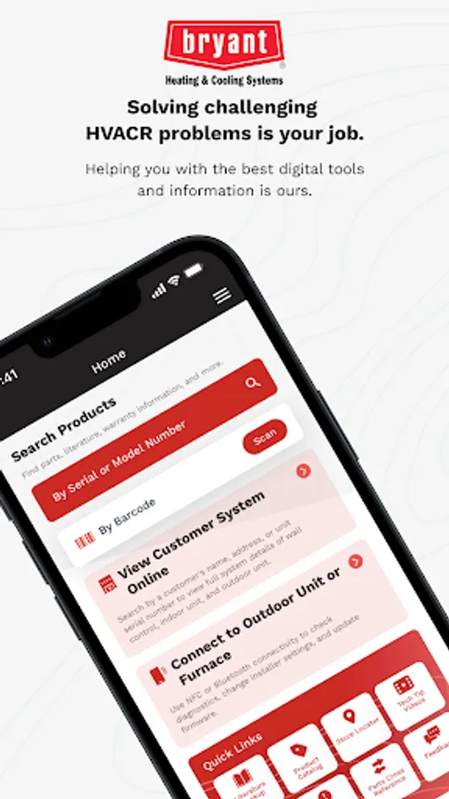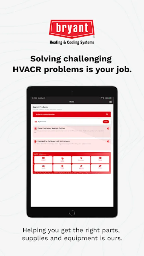 Solving challenging HVAC/R problems is your job. Helping you get the right parts, supplies and equipment you need is ours. Whether it is for warranty repairs for Carrier Equipment or for non-warranty repairs on any make or any brand of equipment, the Bryant Service Technician app can help identify the right part.