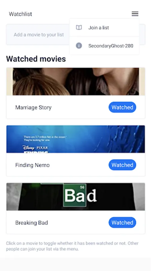 Watchlist is a place to keep track of your movies and TV shows to watch! You can share lists with your friends to keep them in sync.