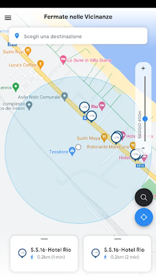 To start you will have to allow access to your position, then choose the search radius from a minimum of m. 100 to a maximum of m. 1000, and then you can immediately view the Stops nearby.