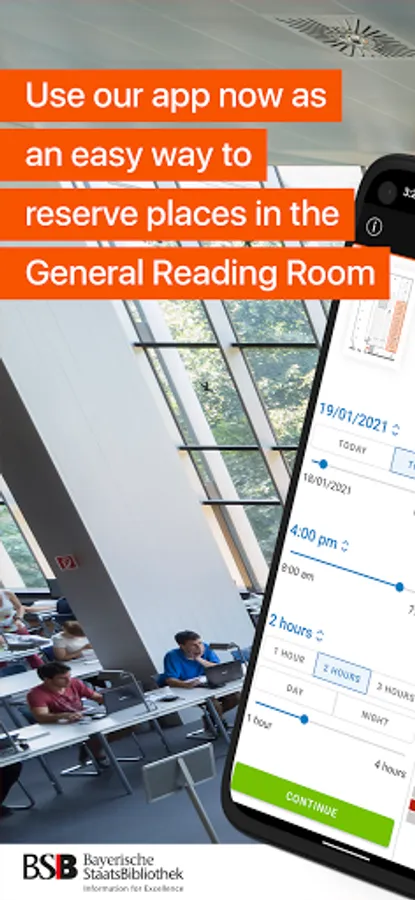 Using the app BSB Reading Room Reservation is an easy and fast way for you to reserve your place in the General Reading Room of the Bayerische Staatsbibliothek.
