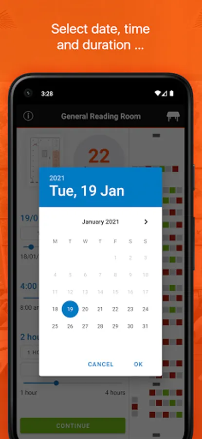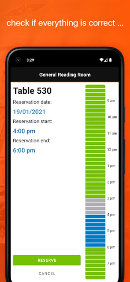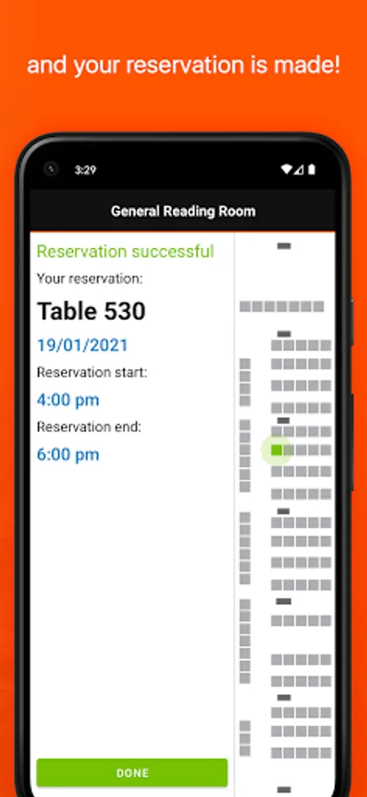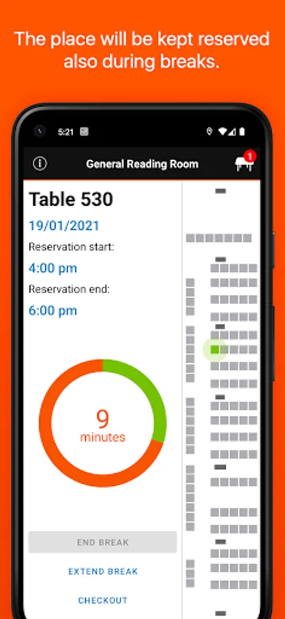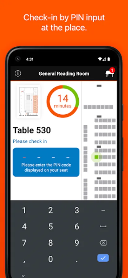 Select the date and time, the duration of the reservation and the desired desk. Up to five dates can be reserved in advance. When you enter the General Reading Room at the start of the reservation period in question, you will find a display with your personal check-in code at the reserved reading desk. In this way, you can check in on site, keep your work place blocked out for other users by using a break function, and you can check out again at any desired time.