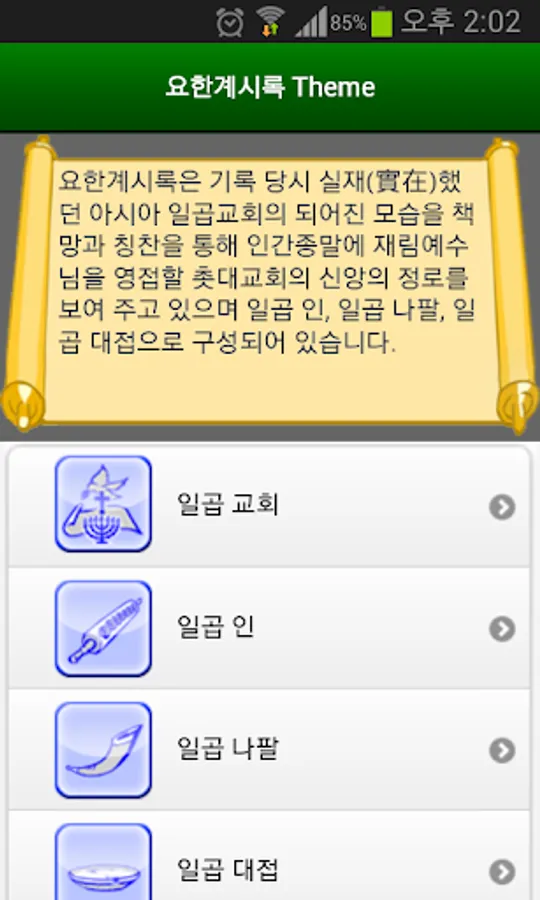 계시록 각 장 강의, 각 장 설교, 난해 구절 설명, 7교회, 7인, 7나팔, 7대접을 테마별로 분류하였습니다.